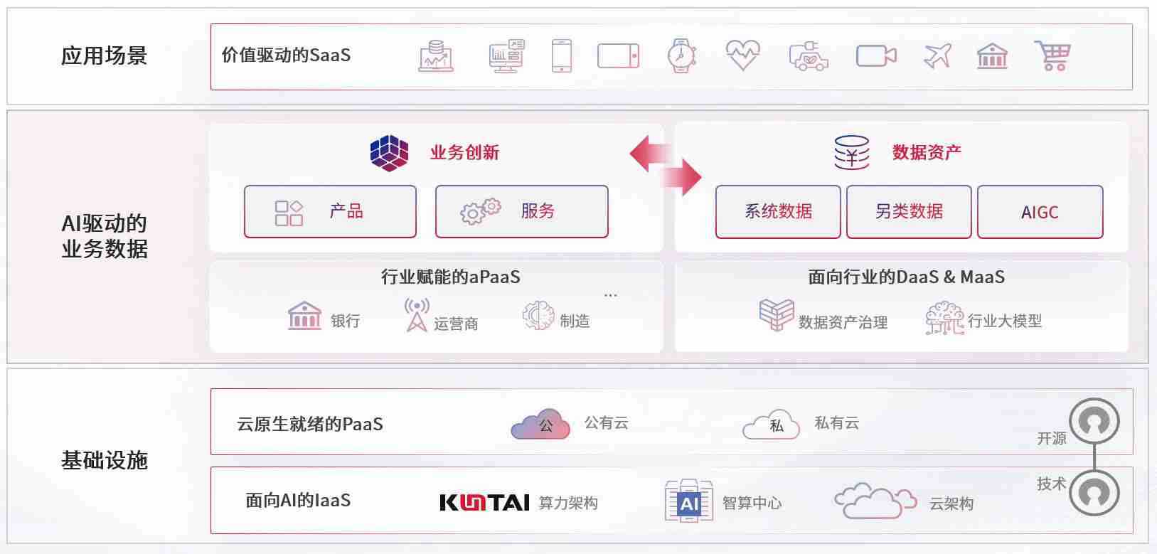 数字时代,,,,围绕企业数字化转型的关键要素,,,尊龙z6数码开创性的提出数云融合战略和技术体系框架,,,,着力在云原生、、数字原生、、、、AI原生和信创产业上架构产品和服务能力,,,,为处在不同数字化转型阶段的快消零售、、、汽车、、、金融、、医疗、、、、政企、、、教育、、、、运营商等行业客户提供泛在的敏捷IT能力和融合的数据驱动能力,,构建跨界融合创新的数字业务场景和新业务模式,,助力企业级客户建立面向未来的核心能力和竞争优势,,全面推动社会的数字化、、、智能化转型升级。。。