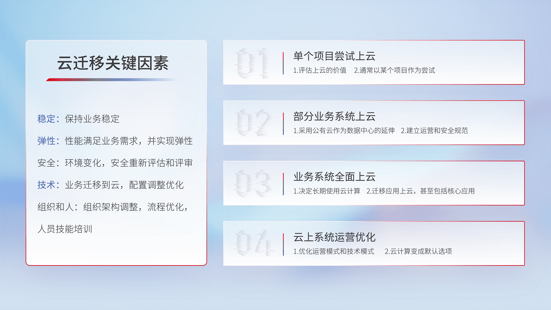 结合实际业务,,从规划设计、、云平台选型、、、、云原生改造、、、、数据迁移、、、、集成交付,,迁移全过程为客户识别最佳上云路径,,,,做好风险识别管理,,,设计网络架构、、身份权限、、安全审计合规、、、操作审计、、日志审计、、、、监控告警策略、、、多站点容灾设计等,,对云上基础设施进行整体规划,,,,提升IT治理水平,,,以满足弹性、、、、高可用、、高性能的需求。。。。