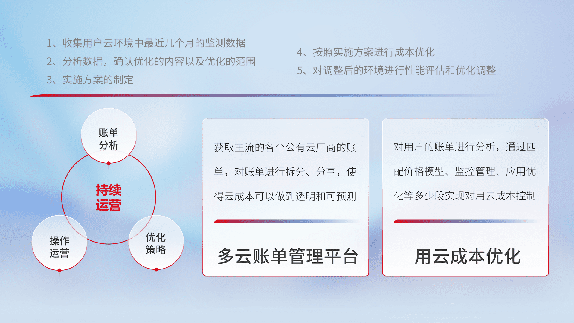 通过多云纳管,,,以统一的资源数据模型把客户的云资源进行抽象和封装,,,进而实现对多云资源的统一操作,,,保障云资源管理的可靠性、、、、稳定性与可用性。。。量身定制化运维内容,,,配置、、、、开发运维、、、、补丁管理、、、、备份、、监控、、认证和访问管理、、审计和日常巡检等,,,,保障在用云过程中的可靠度,,,稳定度以及高可用率。。